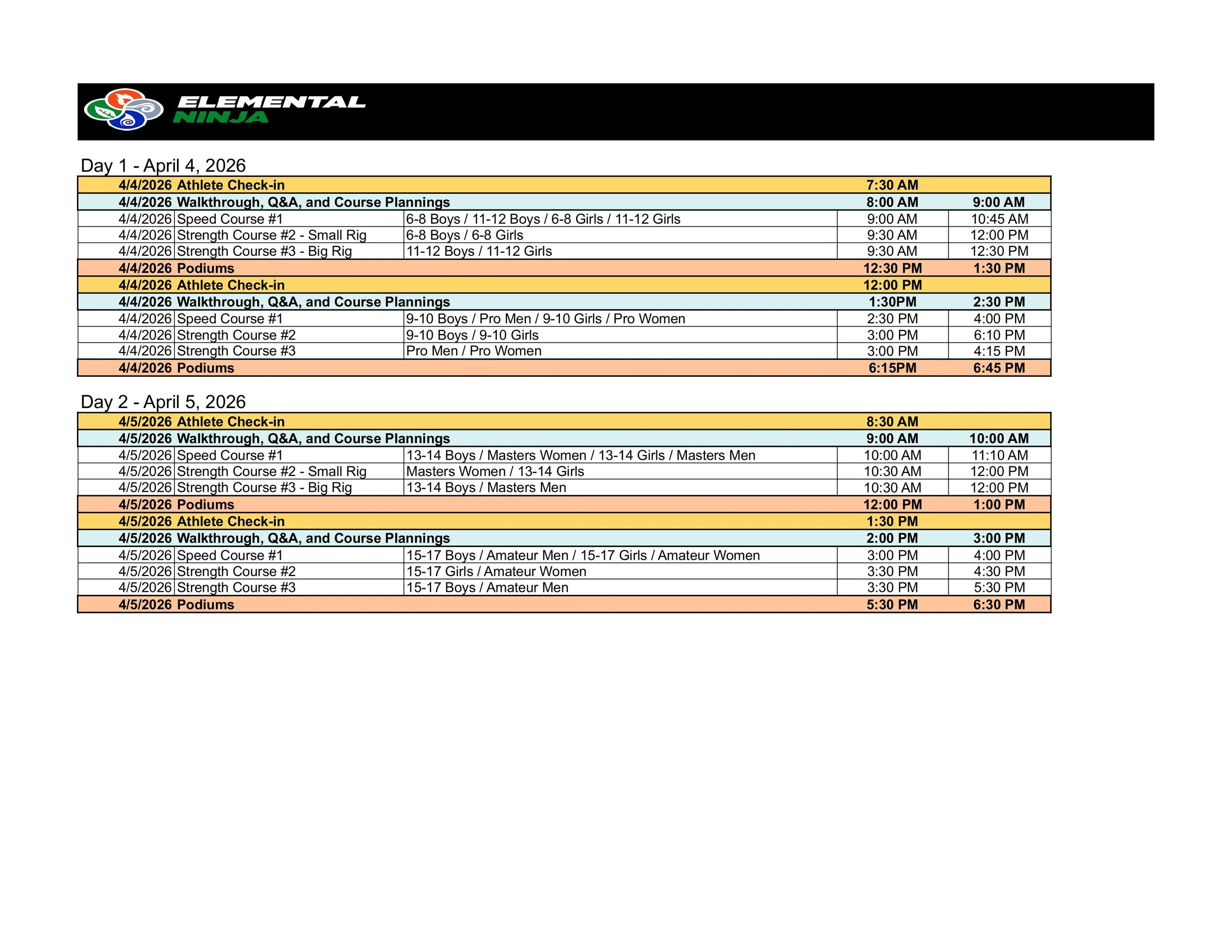 There will be 3 rigs set up. Each category will run their Speed run first, alternating with other categories within their wave. Strength runs will follow in the same run order.